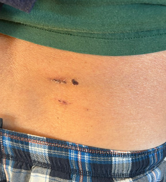 Patient Testimonial: “The photo shows postoperative stitches on my back. Basically, two scratches and a stretched hole with a diameter of 5 mm. Through this hole, a neurosurgeon with the help of a dozen assistants released the blocked nerve, milling the bone from the vertebrae holes, thereby increasing the gap for the nerve.”, Pavel Surguy